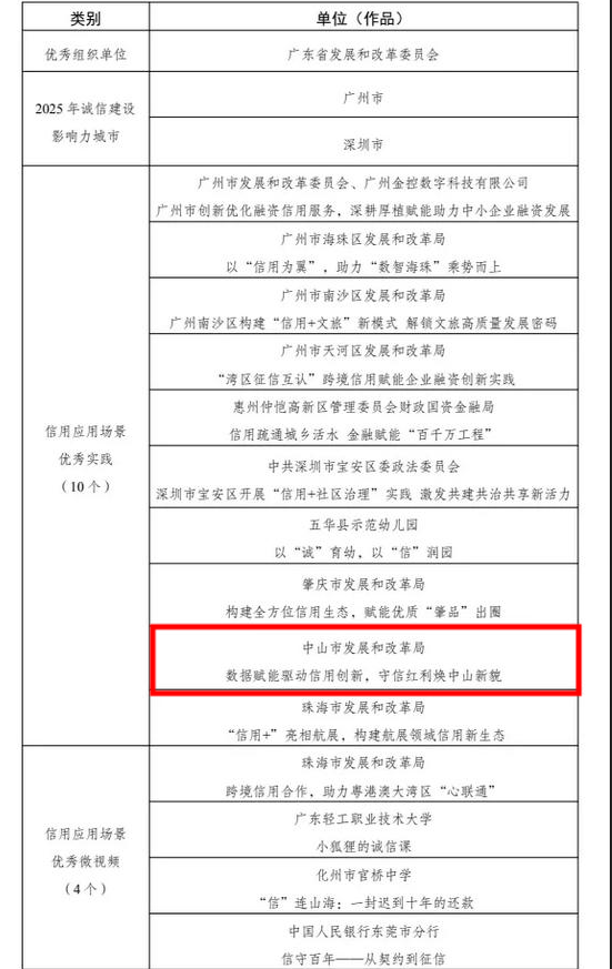 2025年12月13日至14日,第七届中国城市信用建设高峰论坛在浙江省台州市召开。会上公布了第七届全国优秀信用实践及优秀信用应用场景微视频名单,我市发展改革局报送项目《数据赋能驱动信用创新,守信红利焕中山新貌》荣获第七届“新华信用杯”全国优秀信用实践,可喜可贺!
