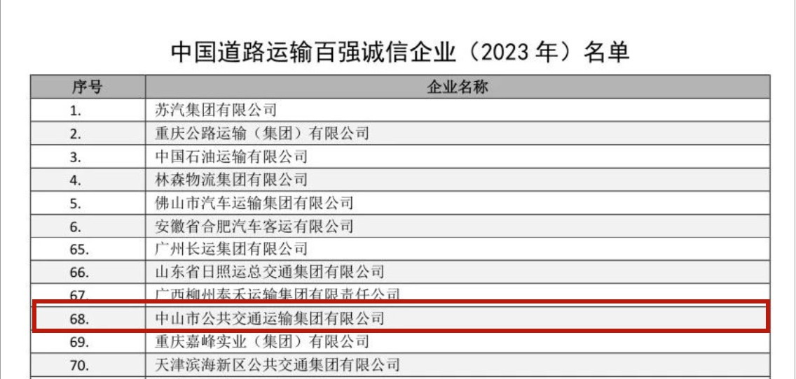9月5日,记者采访了解到,近日中国道路运输协会公布中国道路运输百强诚信企业(2023年)名单,中山市公共交通运输集团有限公司(以下简称“市公交集团”)榜上有名,获得“中国道路运输百强诚信企业(2023年)”荣誉称号。