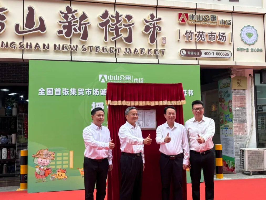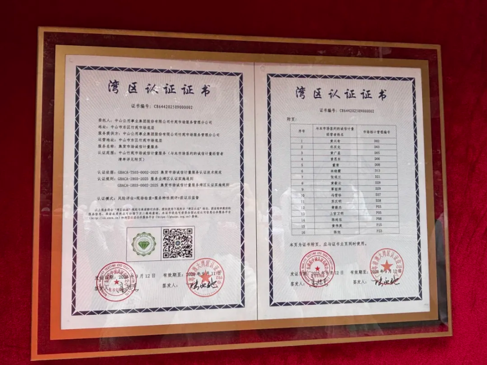 10月31日下午,全国首张集贸市场诚信计量“湾区认证”证书授证仪式在竹苑市场举行,中山公用事业集团股份有限公司竹苑市场成功获颁该证书。这是“湾区认证”赋能民生服务的创新实践,为“湾区认证”体系在更广泛的服务业领域推广应用提供了宝贵的“中山经验”。广东省市场监督管理局党组成员、省知识产权保护中心主任高国盛,中山市人民政府副市长欧阳锦全等出席活动。