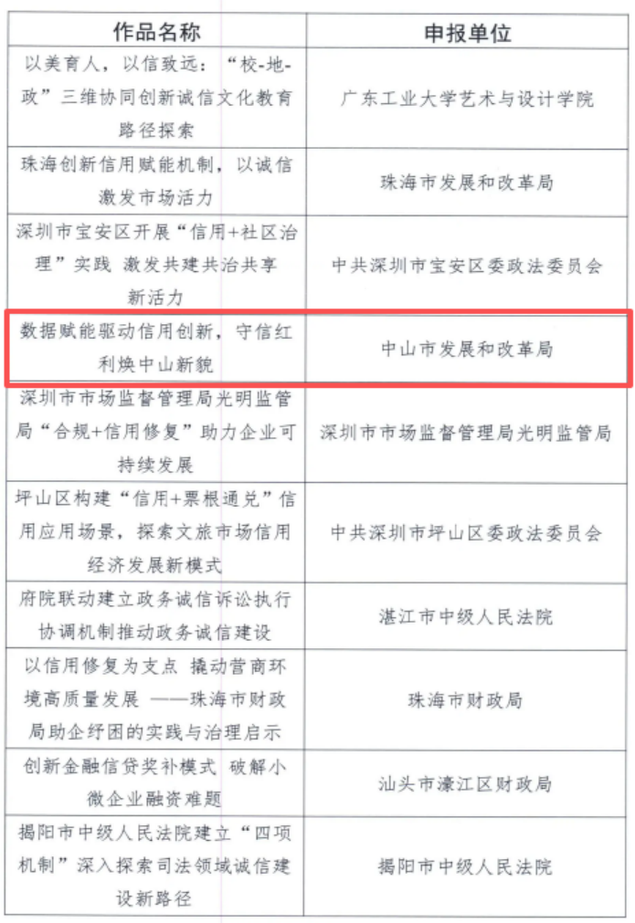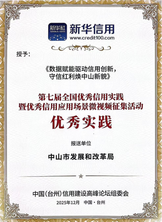 近日,中山市发展和改革局统筹申报的《数据赋能驱动信用创新,守信红利焕中山新貌》项目继入选2025年国家级第七届“新华信用杯”全国信用应用场景优秀实践之后,又入选2025年省级“粤信杯”诚信案例。“信用中山”金字招牌持续擦亮。